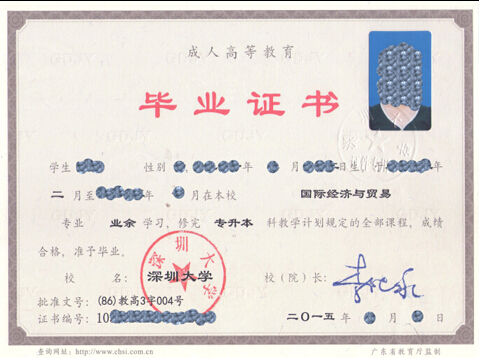 凡被学校正式录取,按规定修完专业教学计划的全部课程且考核合格者,由深圳大学颁发“成人高等教育毕业证书”,专升本符合条件者可申请学士学位。国家承认学历,毕业证书可在国家教育部指定的“中国高等教育学生信息网(www.chsi.com.cn)”查询。