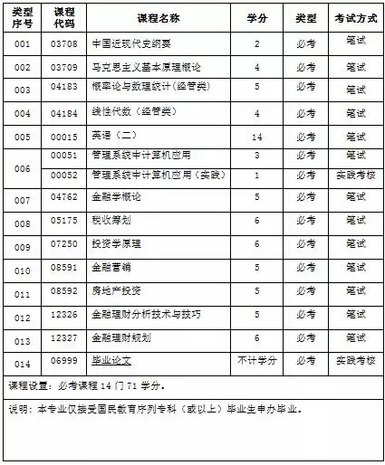 本专业为高等教育自学考试本科学历层次,该专业的必考课程设置为14门课程(含实践性考核),各门课程考试采用学分计算,共计71学分,毕业总学分为71学分。课程考试成绩合格者,取得该课程相应的学分。凡专科毕业后,按照本专业考试计划规定,取得所有课程合格成绩,思想品德经鉴定合格,毕业论文达到规定要求者,将发给国家承认的高等教育自学考试投资理财专业(独立本科段)毕业证书, 同时,其学业水平达到国家规定的学业标准,按照《中华人民共和国学位条例》的有关规定,由由有学位授予权的主考学校授予学士学位。