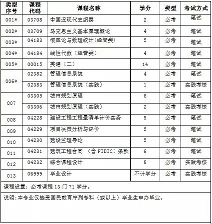 本专业为高等教育自学考试本科学历层次,该专业的必考课程设置为13门课程(含实践考核课程),各门课程考试采用学分计算,共计71学分,毕业总学分为71学分。凡课程考试成绩合格者,取得相应的学分。凡专科毕业后,按照本专业考试计划规定,取得所有课程合格成绩,思想品德经鉴定合格,毕业论文达到规定要求者,将发给国家承认的高等教育自学考试工程造价管理专业(独立本科段)毕业证书, 同时,其学业水平达到国家规定的学业标准,按照《中华人民共和国学位条例》的有关规定,由有学位授予权的主考学校授予学士学位。